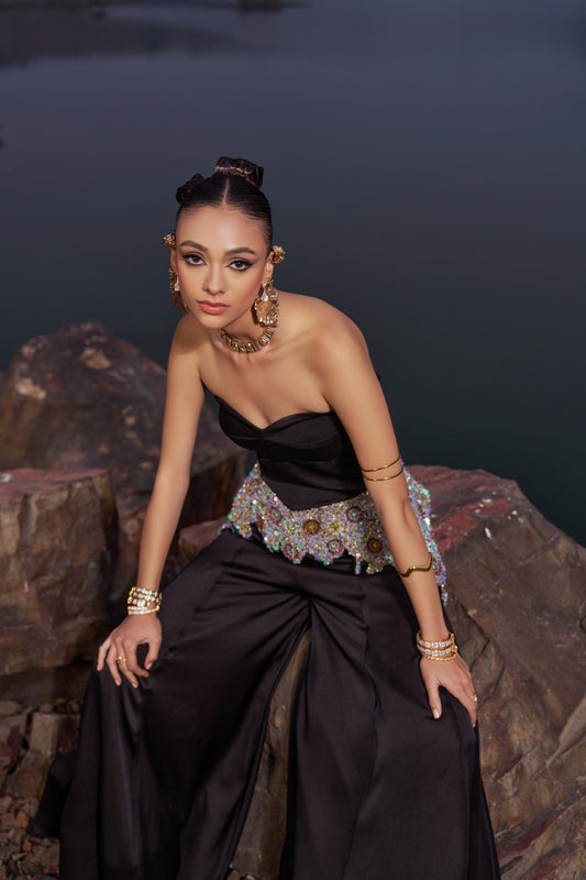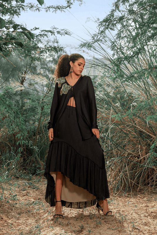 Embroidered Peplum Top Paired with Asymmetric Double Layer Skirt