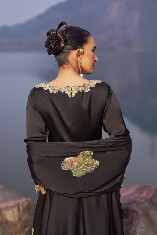 Antique Gold Front Open Short Kalidaar Paired with Sharara and Embroidered Dupatta