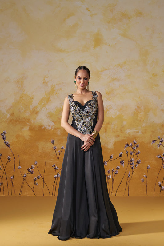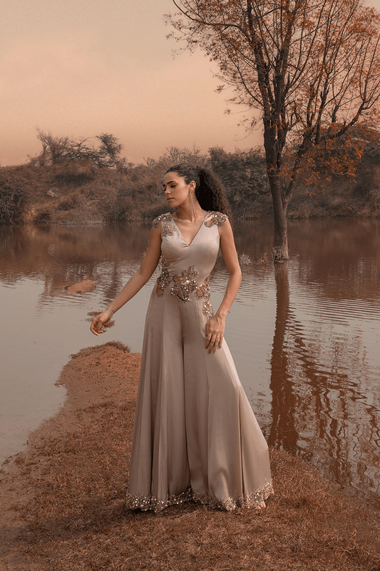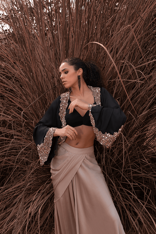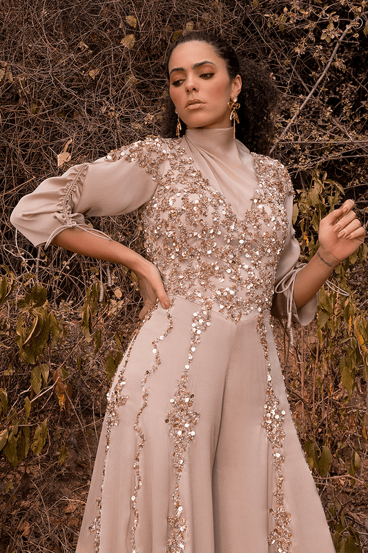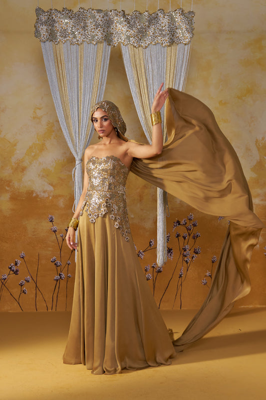 Antique Gold Embroidered Long Jacket Paired with Blouse