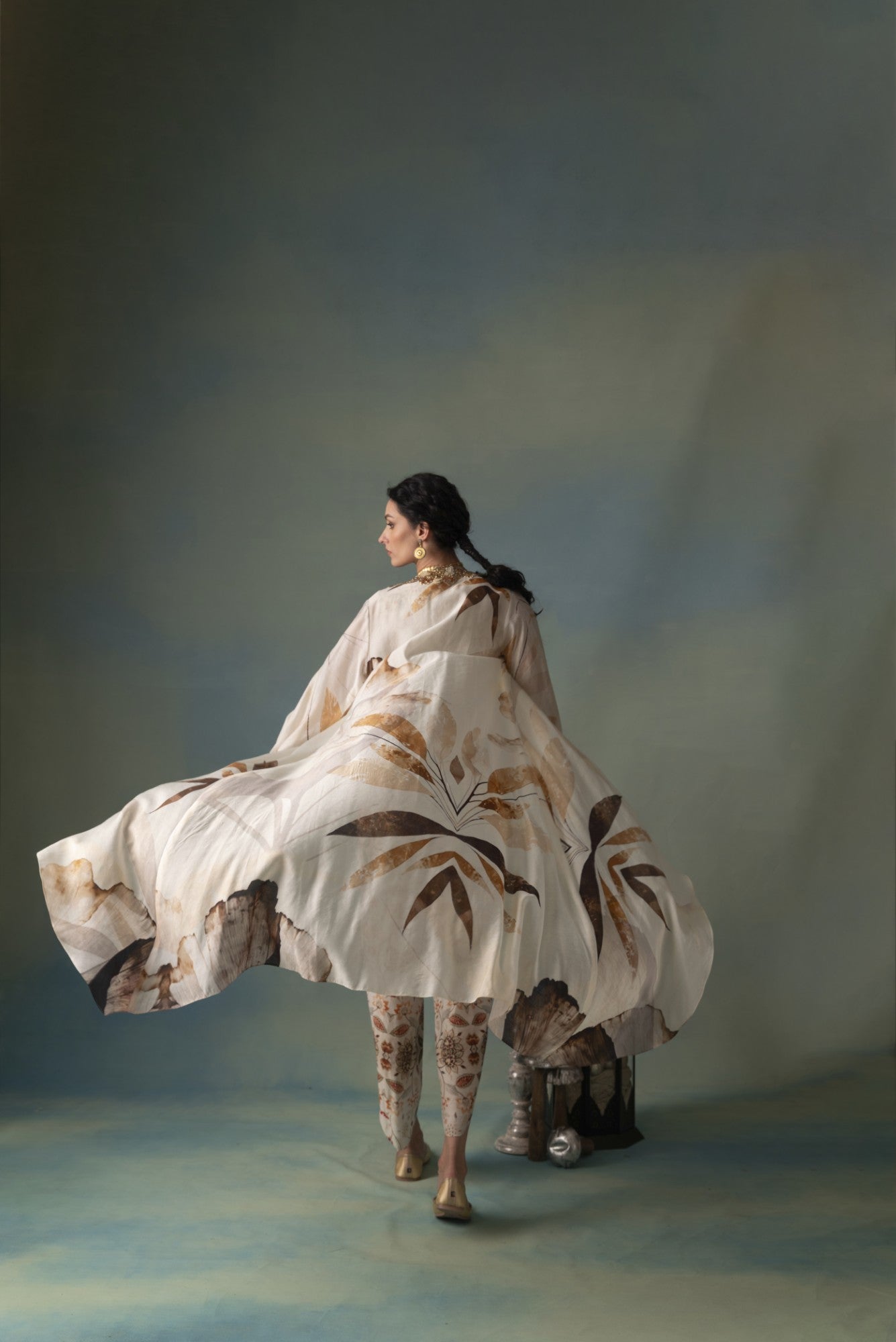 Flowing with effortless grace, this dhoti-style jumpsuit is crafted from soft beige floral Chanderi fabric, perfect for the breezy allure of spring. Paired with a beautifully asymmetrical long jacket, it features intricate mirror nalki zari work and resham embroidery in abstract patterns. Shimmering ivory sequins add a delicate sparkle, making this ensemble a harmonious fusion of tradition and contemporary boho chic—a radiant choice for the modern muse.