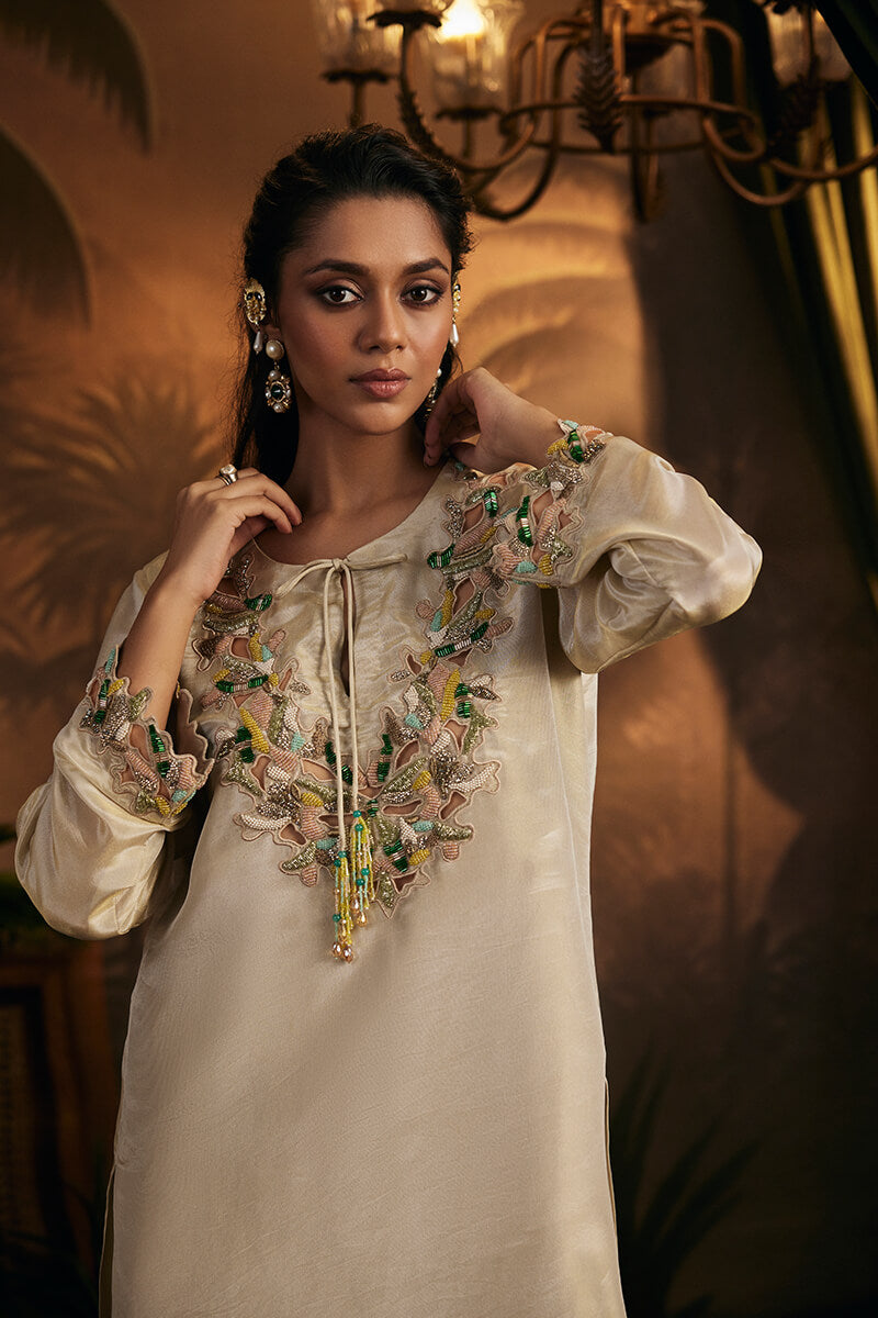 Swish your way through this  season with our shand embroidered tunic with embroidered tassels paired with embroidered salwar and embroidered dupatta